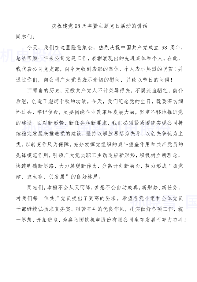 今年是建黨98周年。“七一”前后,襄陽國鐵機(jī)電股份有限公司開展了豐富多彩的紀(jì)念活動(dòng),以傳承紅色基因、弘揚(yáng)革命精神,不忘初心、牢記使命,矢志為中華民族偉大復(fù)興中國夢努力奮斗。
